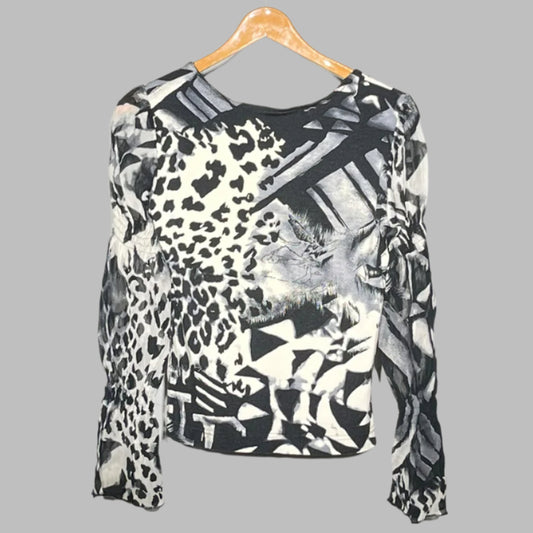 Emozione Abstract Print Mesh Long Sleeve Top – Black & White #156